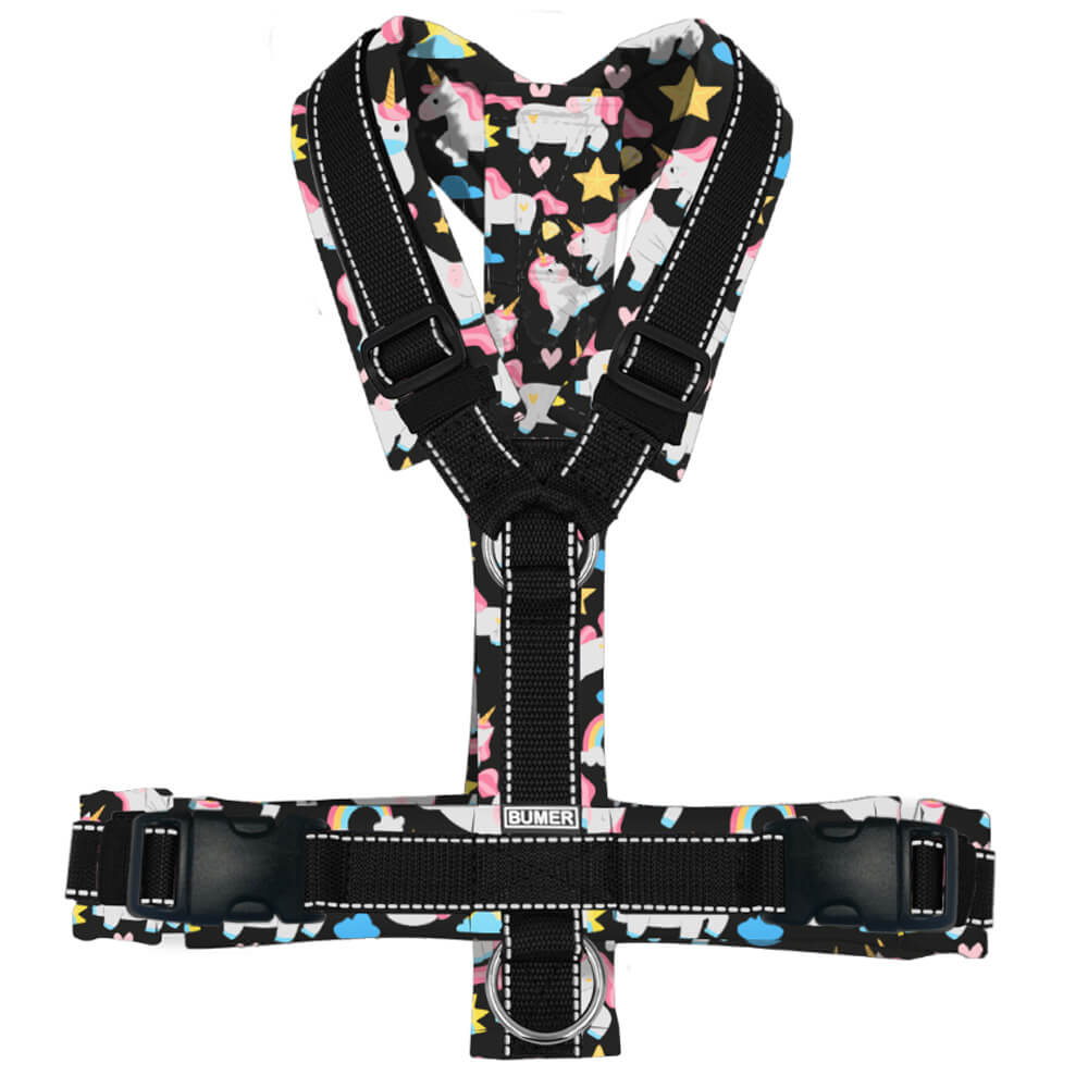 BUMER Hundegeschirr EINHÖRNER, gepolstert, (Softshell), komplett konfigurierbar Konfiguriere aus den Einhorn Mustern. Das gepolsterte Polyester-Material (SOFTSHELL) ist absolut hochwertig, Wasser- und Schmutzabweisend, schnell trocknend, isolierend, atmungsaktiv, strapazierfähig und dennoch ein Leichtgewicht. Das Motiv des Softshell-Materials kann ausgewählt werden. Ebenfalls stehen Gurtbandfarben zur Auswahl oder ein stabilisierender Bruststeg.