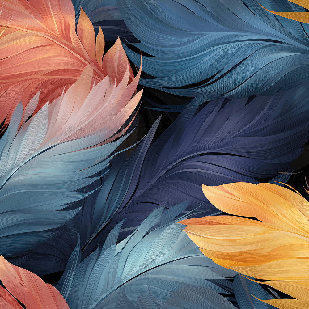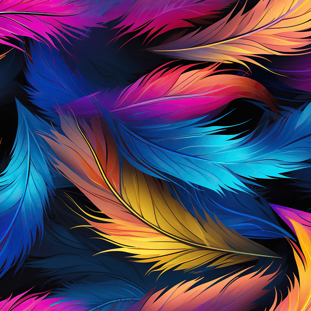 - “Farbwirbel”: Lebendige, bunte Federn auf dunklem Hintergrund für dynamische Hunde.