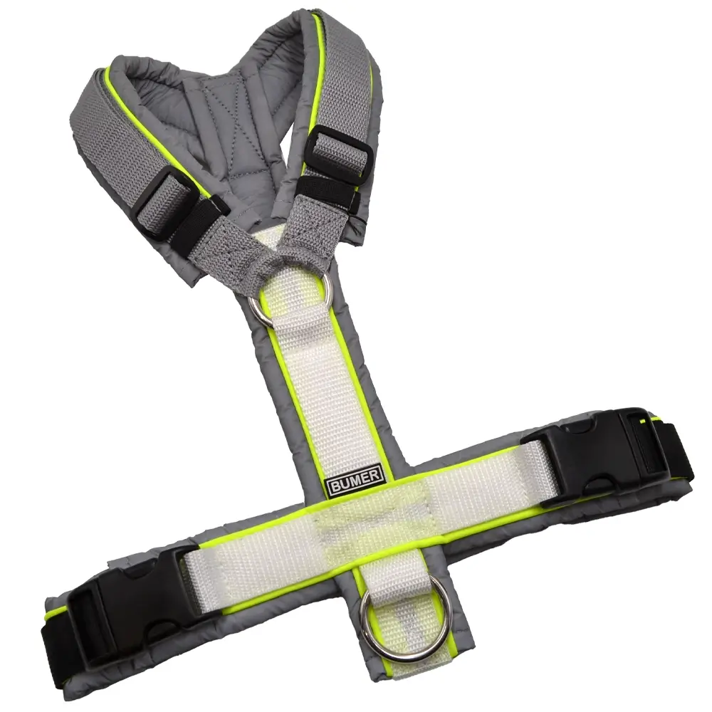BUMER Hundegeschirr, gepolstert ohne geteilten Bruststeg, Größe M, Gurtband: MULTICOLOR, Softshell: grau REFLEX, Ringe: silberfarbig (Edelstahl), Paspel: neongelb (komplett). Dieses Geschirr kannst Du in der Größe M bestellen. Das gepolsterte Softshell Material ist schön anschmiegsam, so dass sich Dein Hund sicherlich wohlfühlen wird. Das Hundegeschirr fällt schön weich und ist pflegeleicht und sehr strapazierfähig.