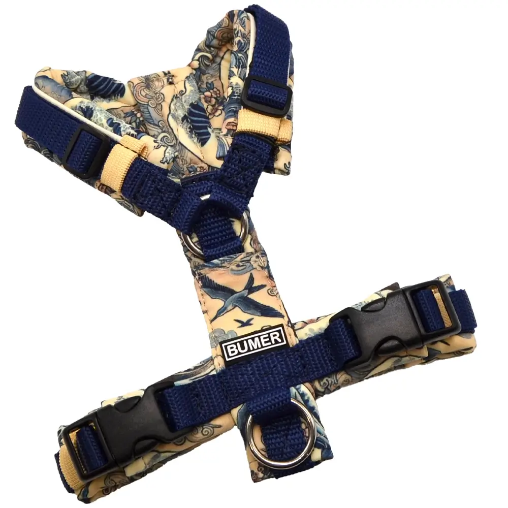 BUMER Hundegeschirr, gepolstert ohne geteilten Bruststeg, Größe XXS, Gurtband: Navy, Softshell: Dance of Waves, Ringe: silberfarbig (Edelstahl), Applikation. Dieses Geschirr kannst Du in der Größe XXS bestellen. Das gepolsterte Softshell Material ist schön anschmiegsam, so dass sich Dein Hund sicherlich wohlfühlen wird. Das Hundegeschirr fällt schön weich und ist pflegeleicht und sehr strapazierfähig.