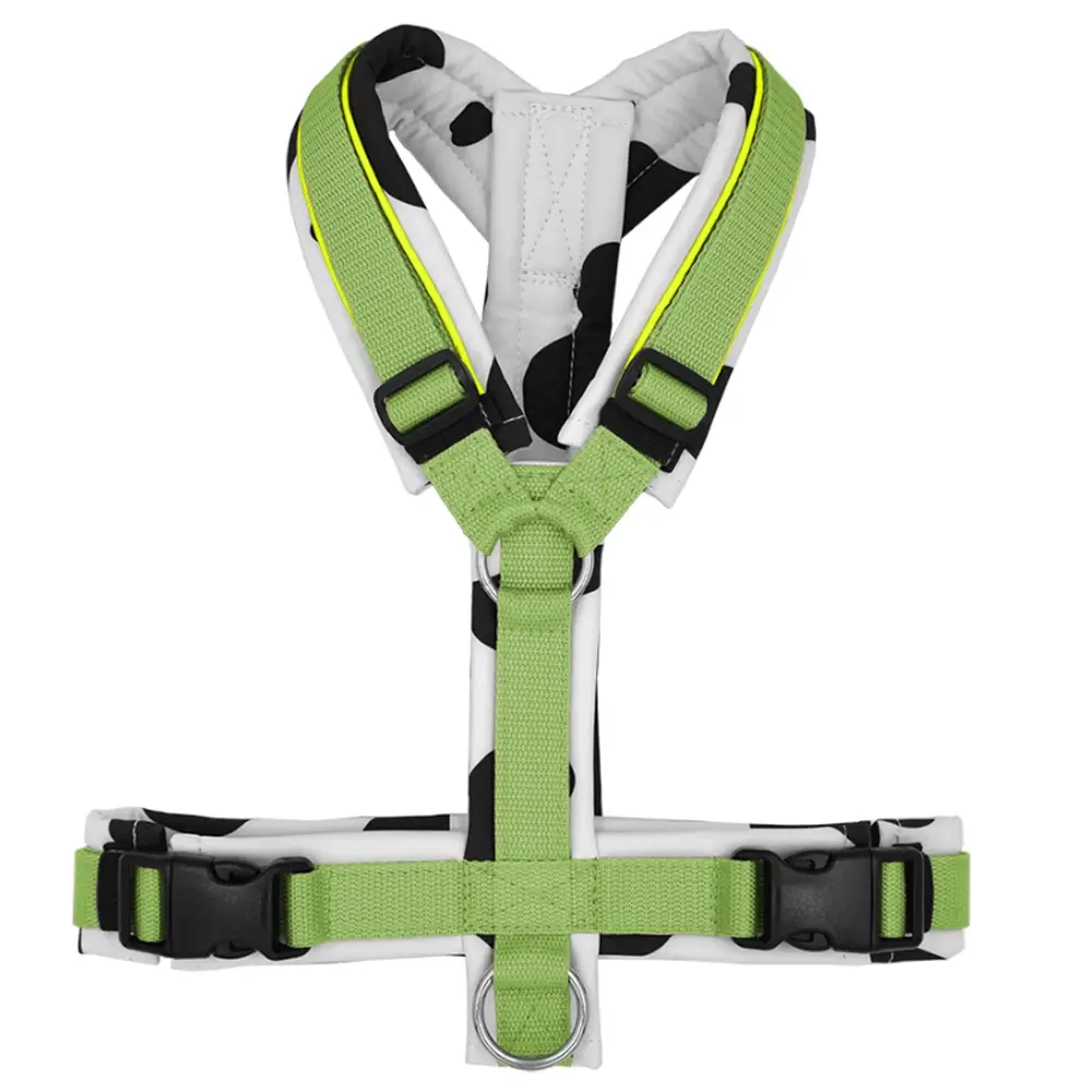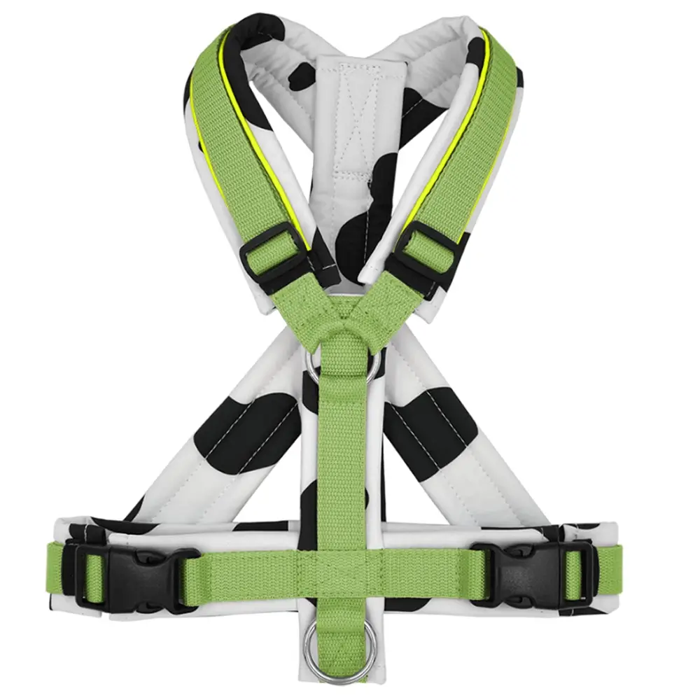 Hundegeschirr Kuhfelldesign, gepolstert, (Softshell). Konfiguriere dieses mit Softshell gepolsterte Hundegeschirr. Das gepolsterte Polyester-Material (SOFTSHELL) ist absolut hochwertig, Wasser- und Schmutzabweisend, schnell trocknend, isolierend, atmungsaktiv, strapazierfähig und dennoch ein Leichtgewicht. Die Farbe des Softshell-Materials kann ausgewählt werden. Ebenfalls stehen Gurtbandfarben zur Auswahl oder ein stabilisierender Bruststeg.