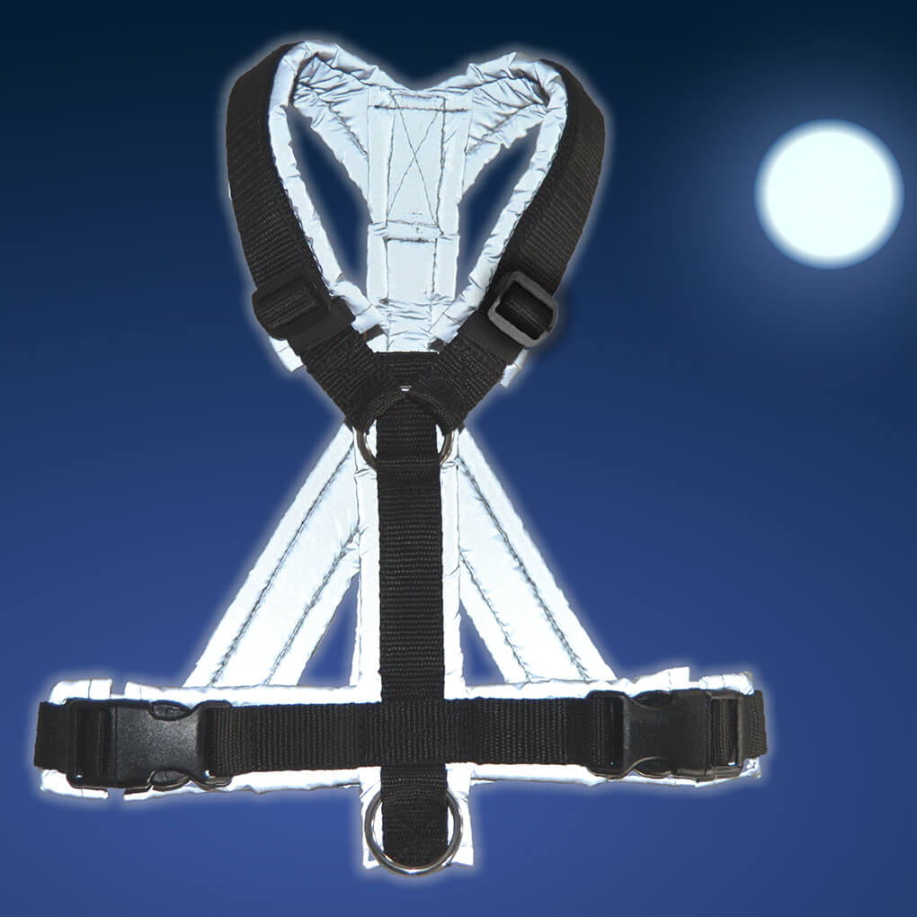 Stark reflektierendes Hundegeschirr zum Wohlfühlen und ordentlich gesehen werden. Y Geschirr mit/ohne Bruststeg. Dieses Geschirr kannst Du in den Größen XXS, XS, S, M, L und XL an. Das gepolsterte, reflektierende Material ist schön anschmiegsam und gemütlich. Dein Hund wird sich wohlfühlen. Das Hundegeschirr fällt schön weich und ist pflegeleicht und federleicht.